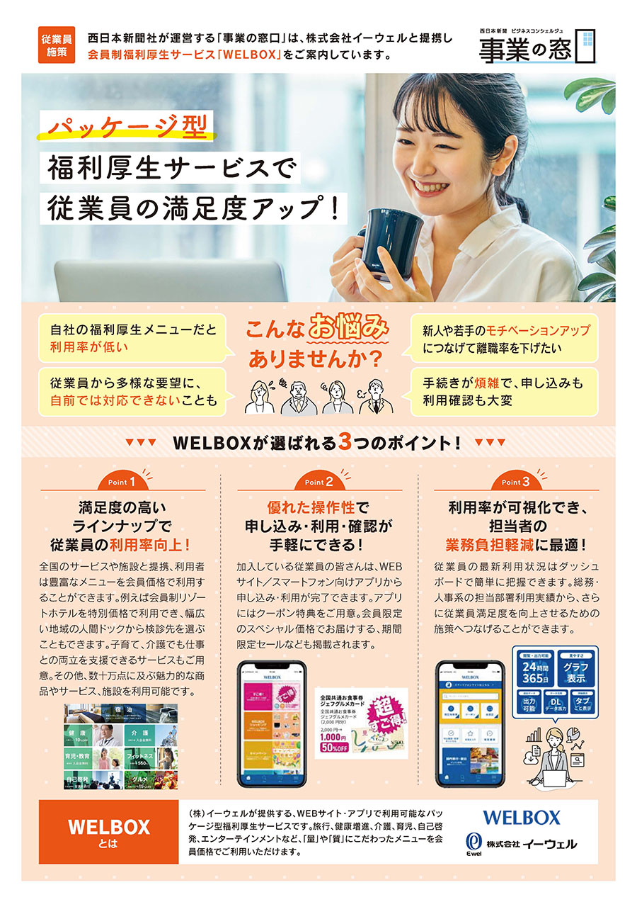 福利厚生面では「WELBOX」で旅⾏や健康増進、介護、育児、⾃⼰啓発、エンターテイメントなど多彩なメニューを会員価格で提供し、従業員の⽣活の質向上を⽀援しています。