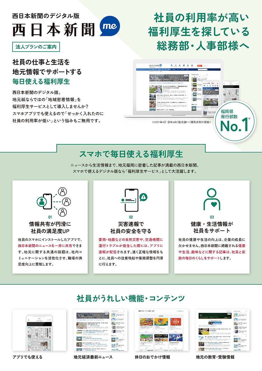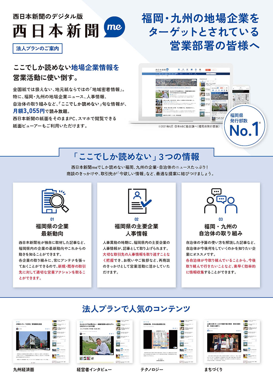 ⻄⽇本新聞meの法⼈プランでは、福岡・九州の企業や⾃治体の独⾃取材による最新ニュース、⼈事情報、地域施策などを網羅。商談のヒントや提案の精度を⾼める情報が満載で、営業活動を⽀援します。