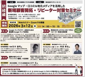 参加無料!Google マップ・口コミ&地元メディアを活用した「新規顧客獲得・リピーター」対策セミナー初級編 3/12開催 開催日 2026年3月12日(木)14:00~15:15 場所 Zoomによるオンラインセミナー メディアや広告の流行り廃りが著しい昨今、注目を集めているのがGoogleマップを活用した新規顧客獲得、そしてLINE公式アカウントを活用したリピーター対策です。 そのノウハウ・戦略を学べる無料オンラインセミナーを2026年3月12日(木)に開催。集客・リピーター戦略で「まず実施すべきこと」について専門家が分かりやすく解説します! ▶︎