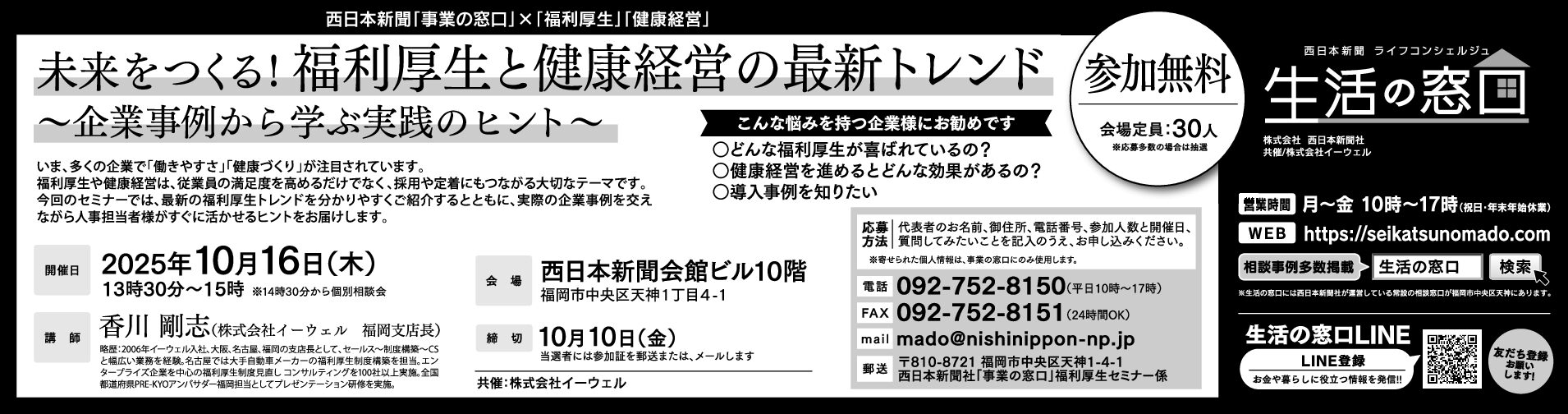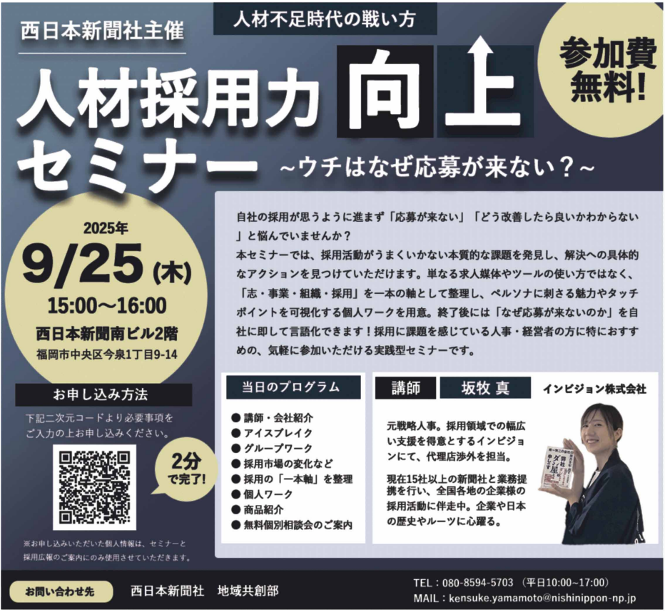 人材採用力向上セミナーを開催します 開催日 2025/9/25(木) 15:00~16:00 場所 西日本新聞南ビル2階(福岡市中央区今泉1丁目9-14) フォームから必要事項をご入力の上お申込みください。 ▶︎