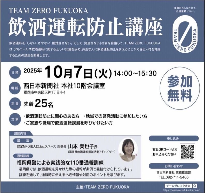 TEAM ZERO FUKUOKA 飲酒運転防止講座を開催します 開催日 2025年10月7日(火)14:00~15:30 場所 西日本新聞社本社10階会議室(福岡市中央区天神1-4-1) フォームから必要事項をご入力の上お申込みください。 ▶︎
